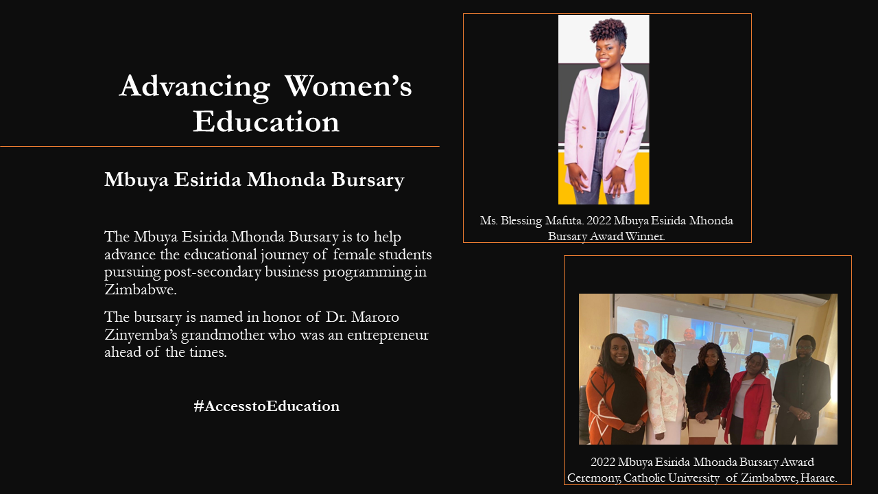 Maroro initiated the Mbuya Esirida Mhonda bursary in honor of the memory and entrepreneurial spirit of her maternal grandmother, Mbuya Esirida Mhonda. The bursary supports female students in financial need and who are enrolled in business education degree programs at the Catholic University of Zimbabwe. Read about the Mbuya Esirida Mhonda Bursary here.